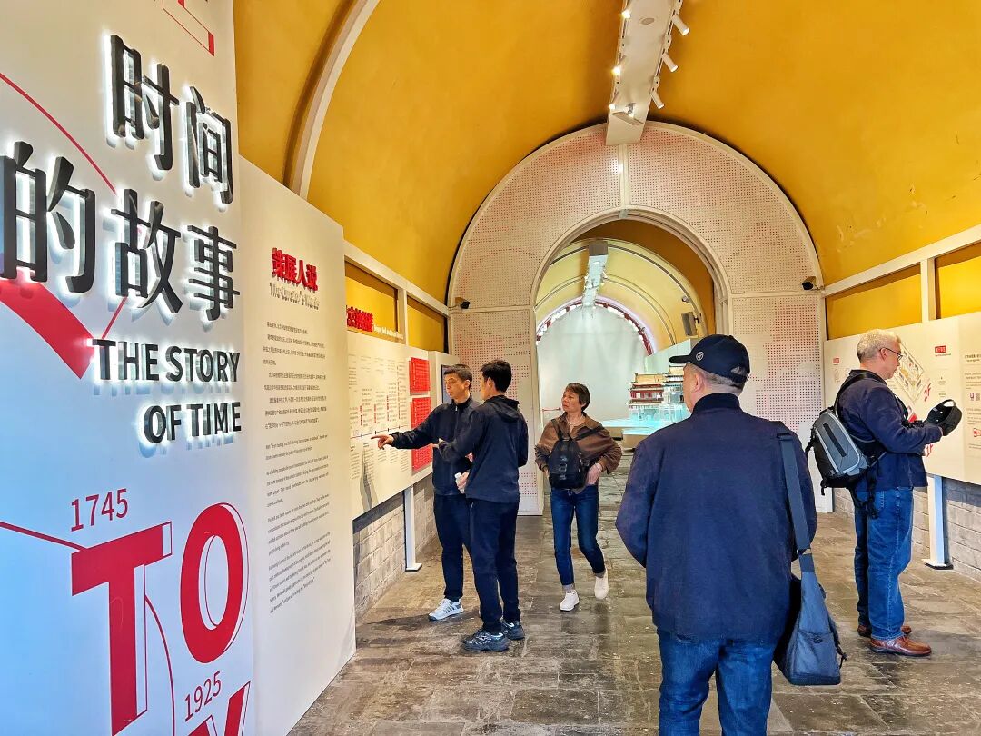 随人流从G口出站,步行约十分钟即可到达鼓楼。如今的鼓楼,早已不是书本中那个刻板的“老古董”。走进一层展厅,“时间的故事”展览正用崭新的方式讲述古老故事。在这里,可以聆听晨钟暮鼓声,也可以在沉浸式光影秀《共鸣》中,感受七百年光阴在墙壁上流动变幻。传统商业街景被生动还原,“卖糖葫芦”“焊洋铁壶”这些源自老北京胡同深处的叫卖声,带着独特的韵调在耳畔回响。一位母亲带着孩子认真聆听那渐行渐远的老北京音韵。最受孩子们欢迎的,当数VR体验区。戴上眼镜,就能跟随屋脊兽“小龙仔”穿越回元大都,亲睹这条中轴线最初的模样……