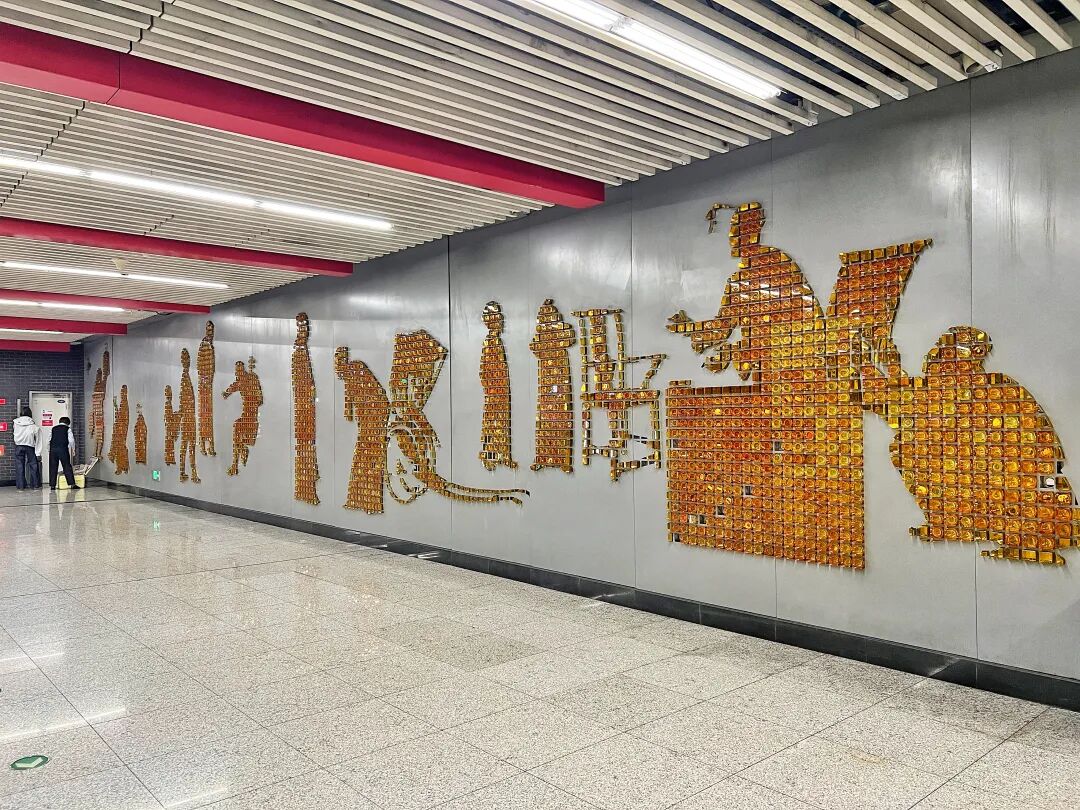 乘坐8号线向北不过十分钟,便抵达前门站。车门开启的瞬间,仿佛推开一扇时空之门,站内朱红色装饰窗、浅橘色梁柱,与多幅主题壁画共同营造出浓郁的前门韵味。在一幅名为《中轴锦绣》的巨幅壁画前,几个孩童踮起脚尖,手指轻触琉璃金瓦的殿顶轮廓,稚嫩笑语中,静默的历史长卷被点染得生机盎然。