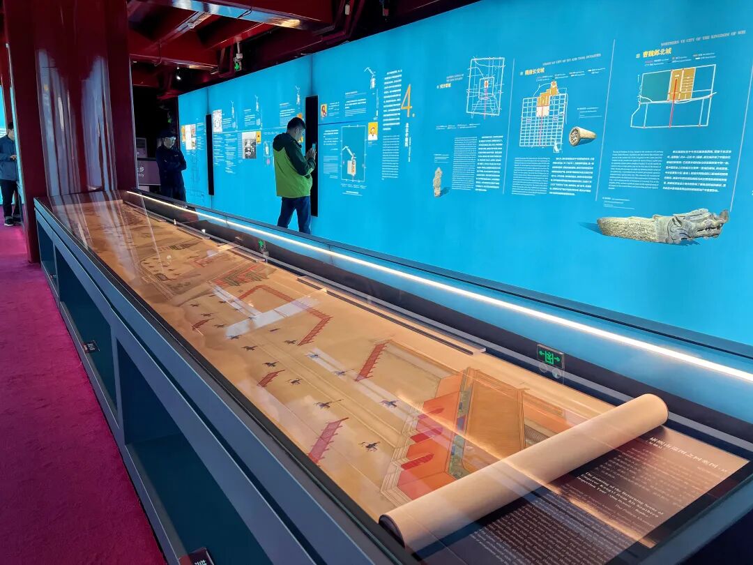 登上箭楼,《北京中轴线——中国理想都城秩序的杰作》专题展栩栩呈现眼前,专题展以“遗产描述—价值阐释—保护传承”为脉络,系统梳理这条文化脊梁的前世今生。按照参展路线拾级而上,二层展厅展柜陈列着祭天礼器、金砖、压胜锡盒等珍贵物件,揭示了古代建筑中的智慧与信仰。长达7米的《康熙南巡图之回銮图》(复制品)尤为震撼,生动描绘了康熙皇帝从前门大街至大清门的盛大仪仗,画中正阳门、大清门等中轴建筑清晰可辨,堪称“清代的京城全景图”。