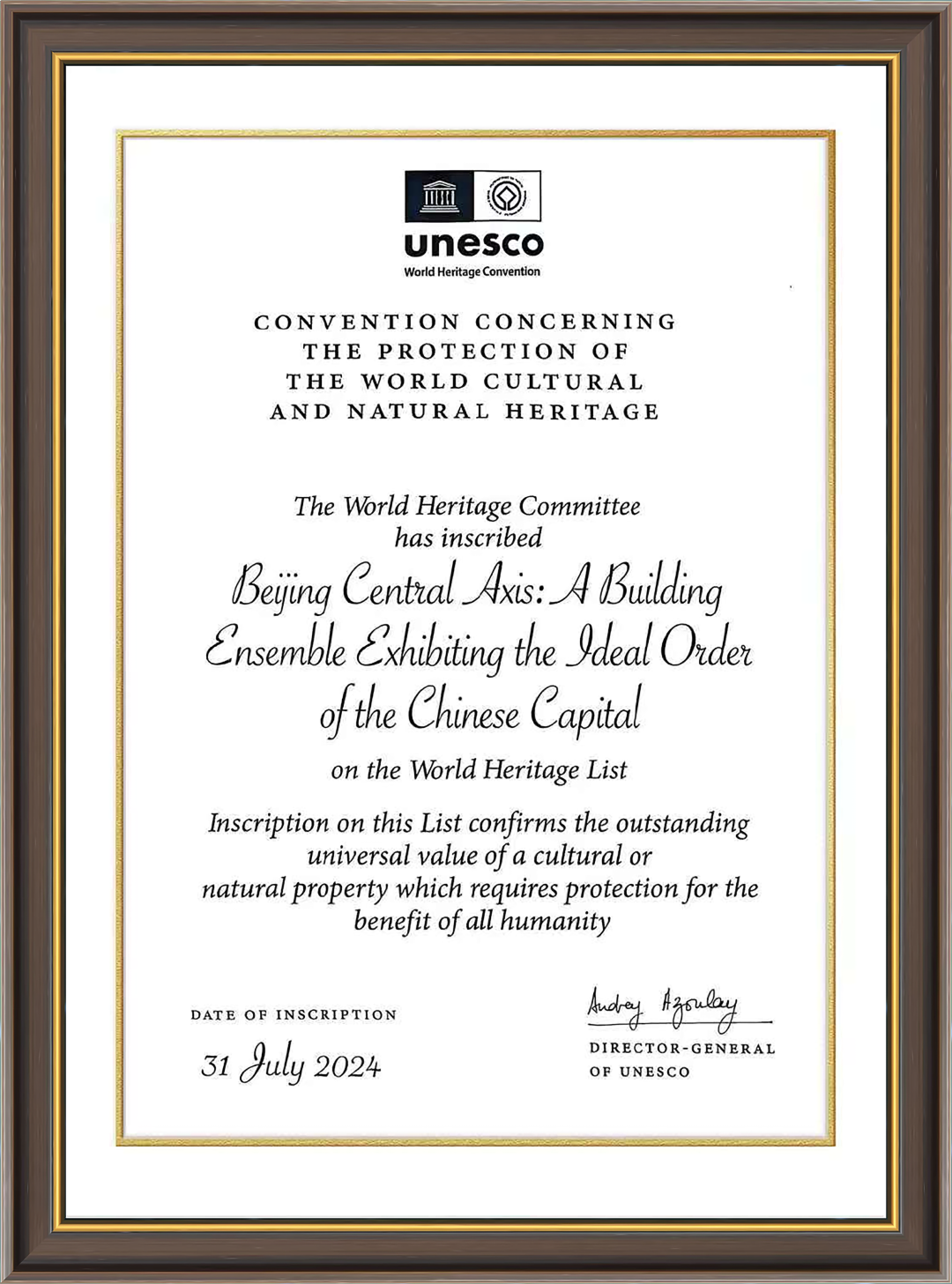 9月19日下午,《北京中轴线世界遗产证书》颁发仪式在正阳门箭楼举行,联合国教科文组织总干事阿祖莱为北京颁发中轴线世界遗产证书。2024年7月27日,联合国教科文组织第46届世界遗产大会通过决议,将“北京中轴线——中国理想都城秩序的杰作”列入《世界遗产名录》。一年来,北京深入贯彻落实习近平总书记对加强文化和自然遗产保护传承利用工作的重要指示精神,持续加强中轴线文化遗产保护利用,进一步带动老城整体保护,推动“古都之脊”焕发新活力、绽放新光彩。