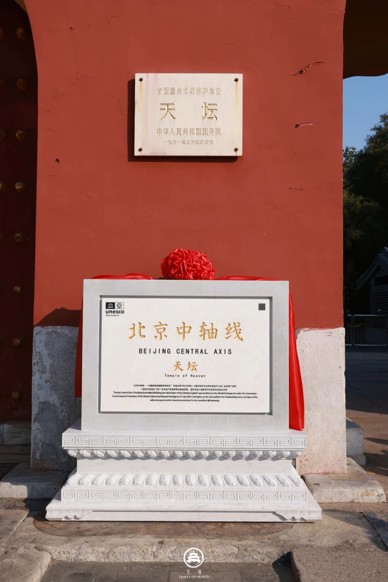 1998年天坛入选《世界遗产名录》并于2000年在南门内设立世界遗产碑;如今为了铭记北京中轴线申遗成功这一历史性成果,天坛再立新碑,与世界共同守护珍贵的文化根脉。