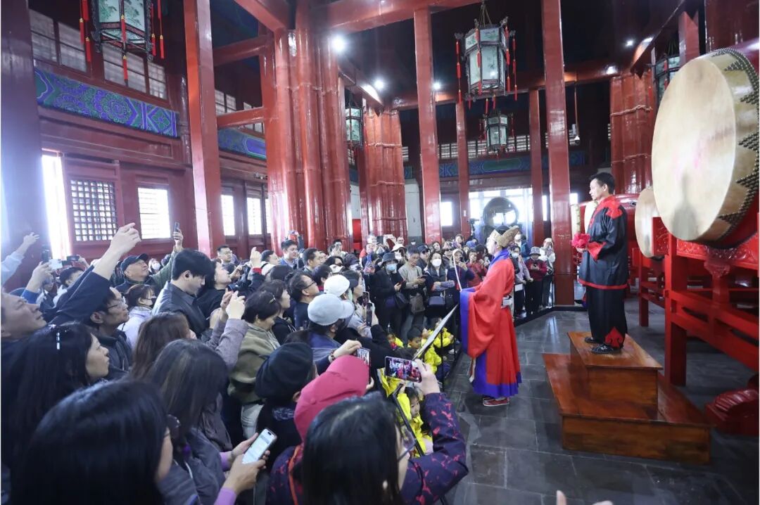 在古代,漏刻博士掌漏刻以计时,司晨听鸡鸣而呼旦唱时。如今,两位身着华丽汉服的礼官NPC将会出现在北京钟鼓楼,为游客朋友们带来别开生面的沉浸式体验。