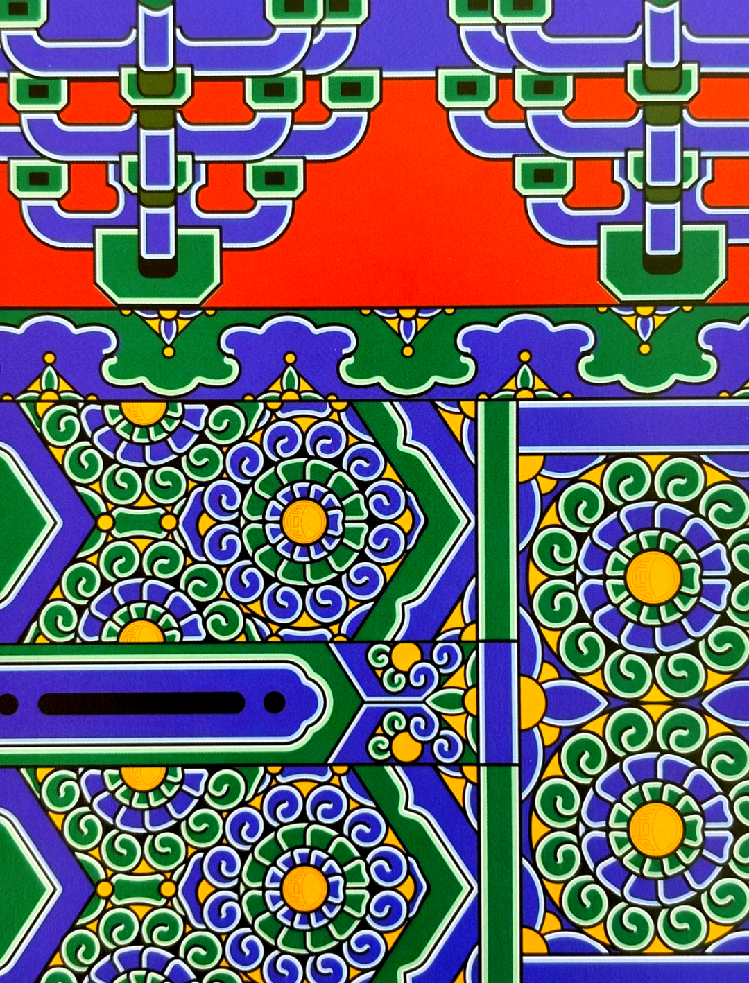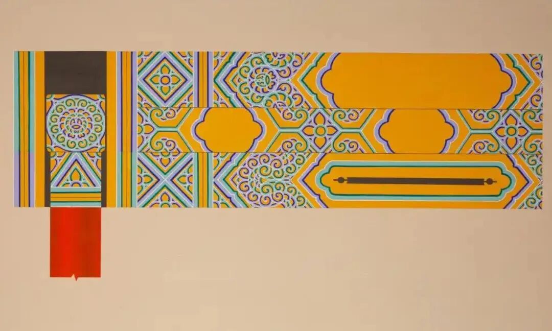 “一整两破”是旋子彩画中较为基本的旋子组合形式,即一整朵旋子团花和两个半圆旋子团花的组合图案。