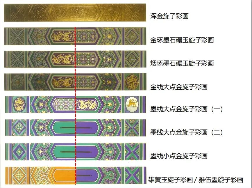如按各个部位用金的多寡和花色的繁简程度,旋子彩画可分为:浑金旋子彩画、金琢墨石碾玉旋子彩画、烟琢墨石碾玉旋子彩画、金线大点金旋子彩画、墨线大点金旋子彩画、墨线小点金旋子彩画、雅伍墨旋子彩画、雄黄玉旋子彩画。