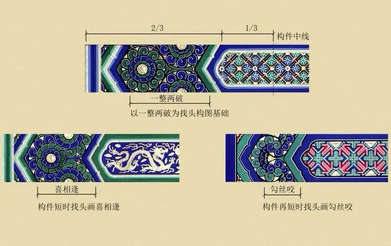 旋子彩画根据找头的长短,旋花可灵活组合处理,根据组合形式的不同,又可分为:一整两破、喜相逢、勾丝咬。