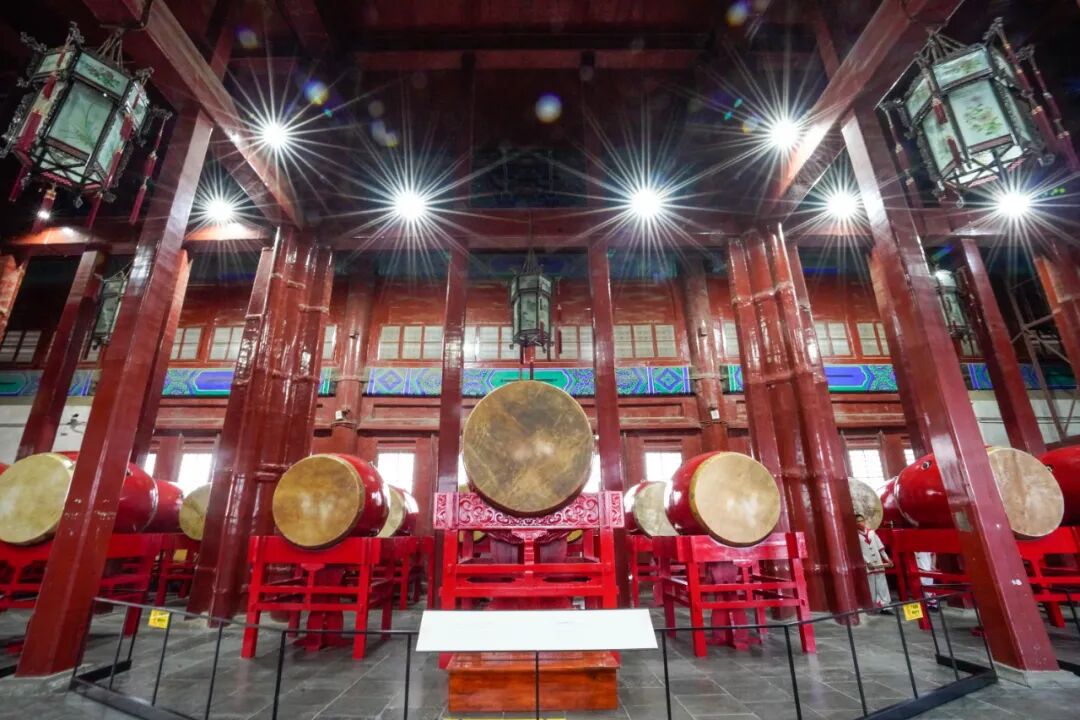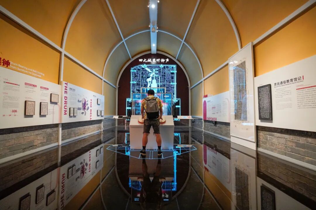 鼓楼的击鼓表演是一定不容错过的,从24面大鼓的节奏中体验中华文脉的久远,站在鼓楼南望中轴线,与北京城的历史来一次亲密接触。鼓楼一层券洞打造成“时间博物馆”,依托数字技术的虚拟更鼓与永乐大钟互动体验设备最受游客青睐。“敲击”鼓面就会泛起光影涟漪,推动模拟钟杵,钟声便通过环绕音响深沉荡开。游客还能在“四九城里听钟声”展项前戴上耳机,轻触屏幕选择清代京城地图的不同位置,聆听不同位置的悠扬钟声。