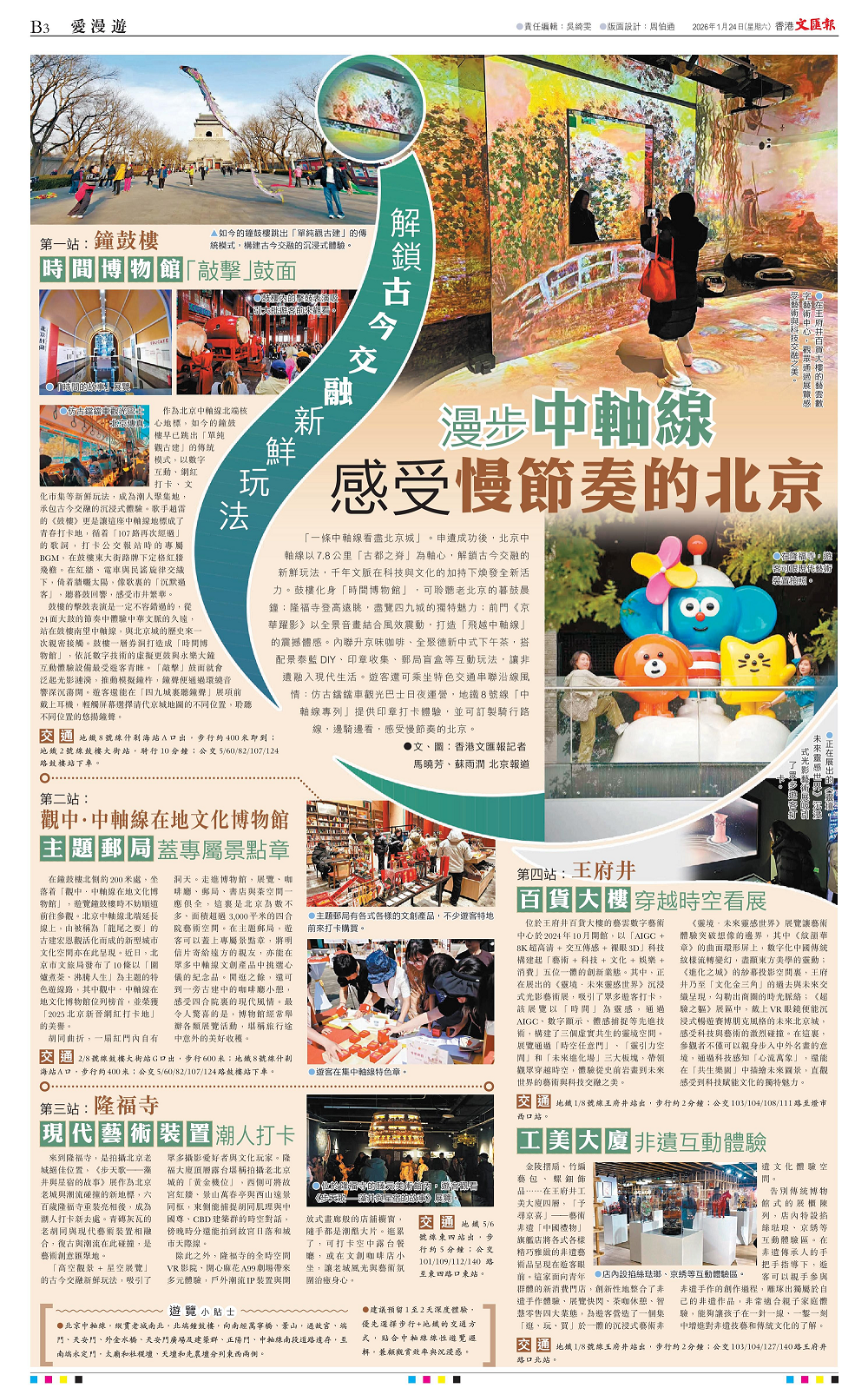 1月24日,《香港文汇报》B3爱漫游版刊发专版《解锁古今交融新鲜玩法,漫步中轴线,感受慢节奏的北京》,全文如下: