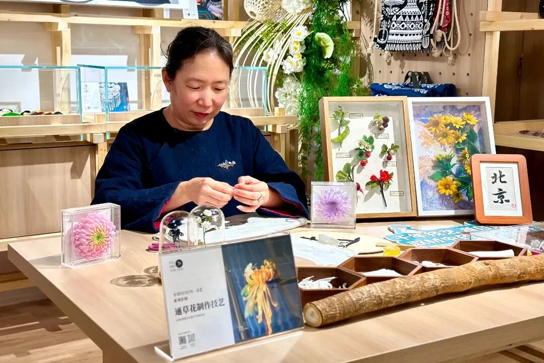 告别传统博物馆式的展柜陈列,店内特设掐丝珐琅、京绣等互动体验区。在非遗传承人的手把手指导下,游客可以亲手参与非遗手作的创作过程,雕琢出独属于自己的非遗作品,非常适合亲子家庭体验,能够让孩子在一针一线、一錾一刻中增进对非遗技艺和传统文化的了解。