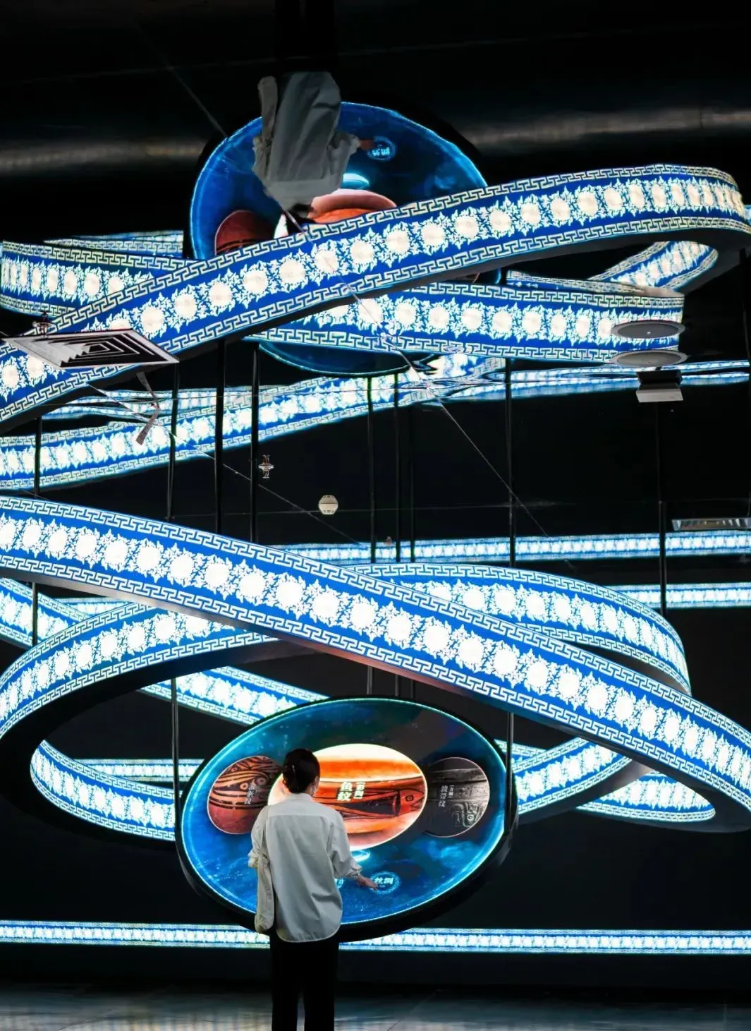 《灵境·未来灵感世界》展览让艺术体验突破想象的边界,其中《纹韵华章》的曲面环形屏上,数字化中国传统纹样流转变幻,尽显东方美学的灵动;《进化之城》的纱幕投影空间里,王府井乃至“文化金三角”的过去与未来交织呈现,勾勒出商圈的时光脉络;《超验之躯》展区中,戴上VR眼镜便能沉浸式畅游赛博朋克风格的未来北京城,感受科技与艺术的激烈碰撞。在这里,参观者不仅可以亲身步入中外名画的意境,通过科技感知“心流万象”,还能在共生乐园中描绘未来图景,直观感受到科技赋能文化的独特魅力。
