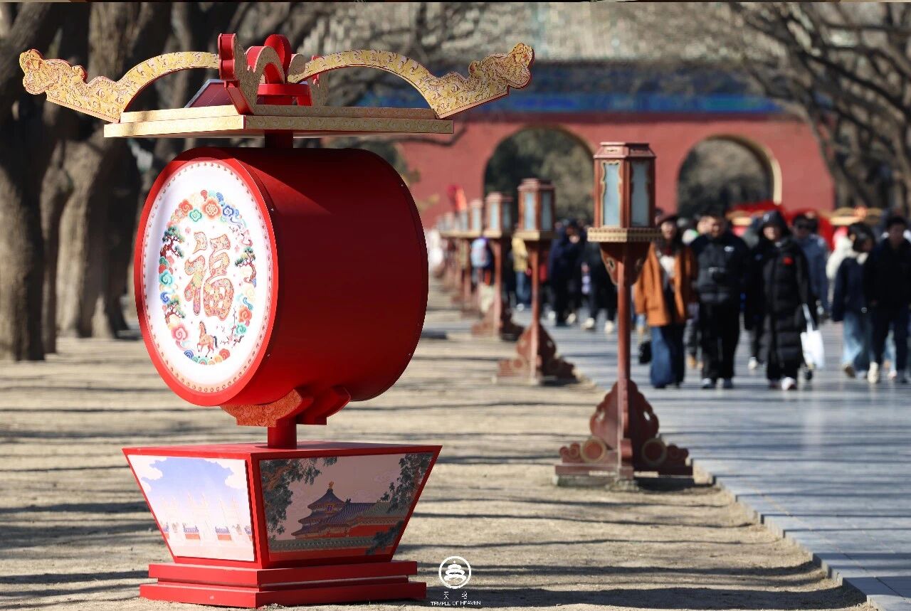 春鼓开道,瑞马垂光。春风如擂,公园道路两侧的“福韵话民俗”主题福鼓为大家送来一路欢喜。而瑞马造型的地插式灯笼,沿北门至北二门次第排开,点亮了千千灯火,与祈年殿夜景交相辉映。天坛新春吉祥物“瑞马”更是扬鬃奋蹄,头顶祈年殿,背载搏拊鼓,颈挂金钟,红底金字福袋承载着“福气满袋、万事顺遂”的新春祝福,为大家驾来遍地祥瑞好运。