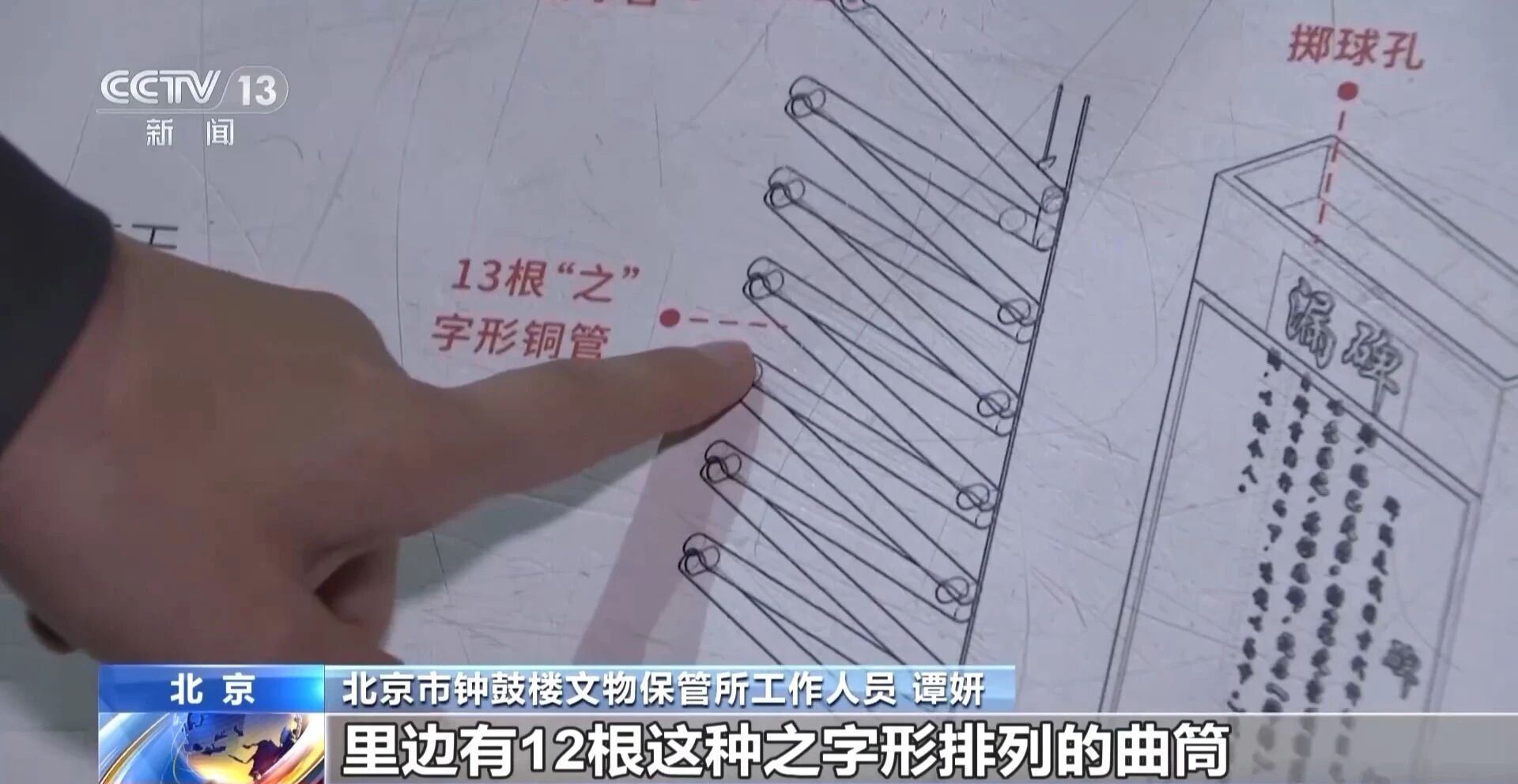 北京市钟鼓楼文物保管所工作人员 谭妍:碑漏是元代鼓楼初建时候使用的一种计时仪器,里边有12根这种之字形排列的曲筒,最上方有一个储球桶。当第一个金属小球随着这12根之字形的曲筒滚落到最下方,击落铜铙发出响声,全程是24秒。一天24个小时,需要滚动3600个金属小球,以此来换算时间。