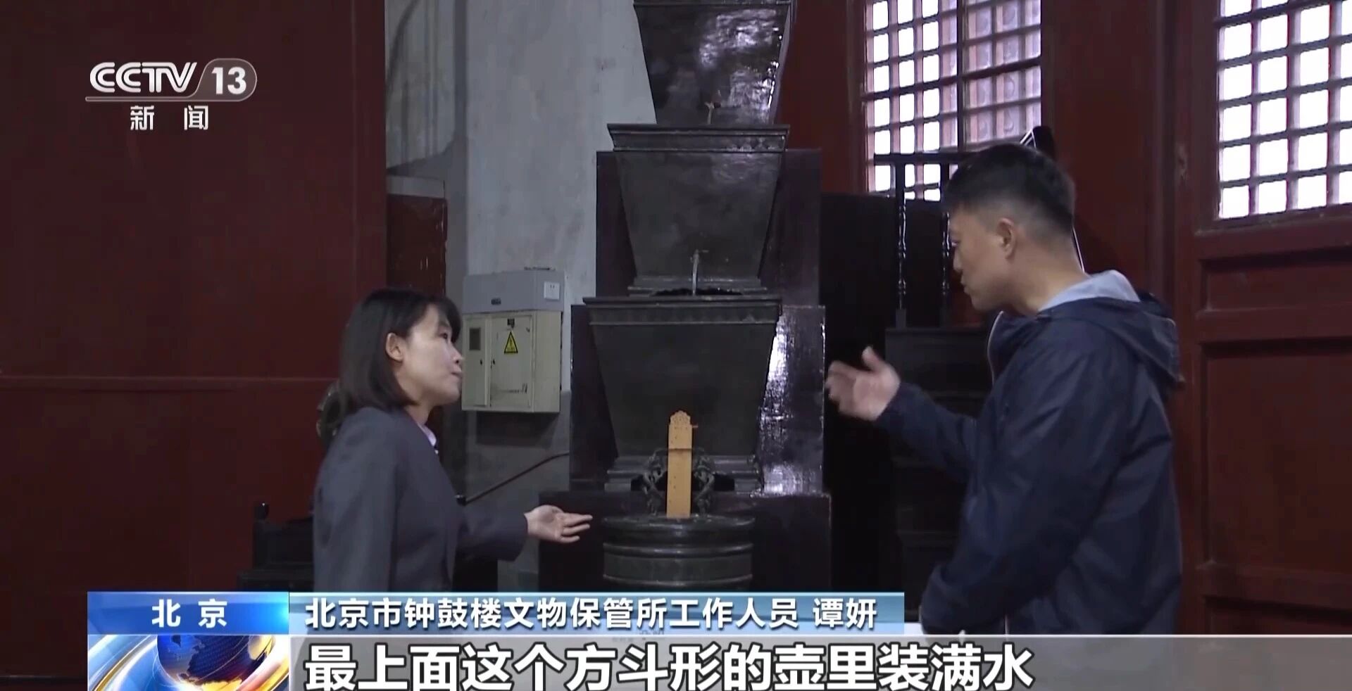 北京市钟鼓楼文物保管所工作人员 谭妍:在最上面这个方斗形的壶里装满水,这个水会逐级流送,到最下方流到这个圆柱形的收水壶里。有一个双龙抱扶箭尺,它会根据水的浮力来上升,显示相应的刻度,代表相应的时间,红点就是代表当时的日出和日落的时间。
